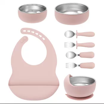 Color Kids 8PCS Stainless Steel Silicone Baby Feeding Set with Detachable Bowl & Bib - BPA Free